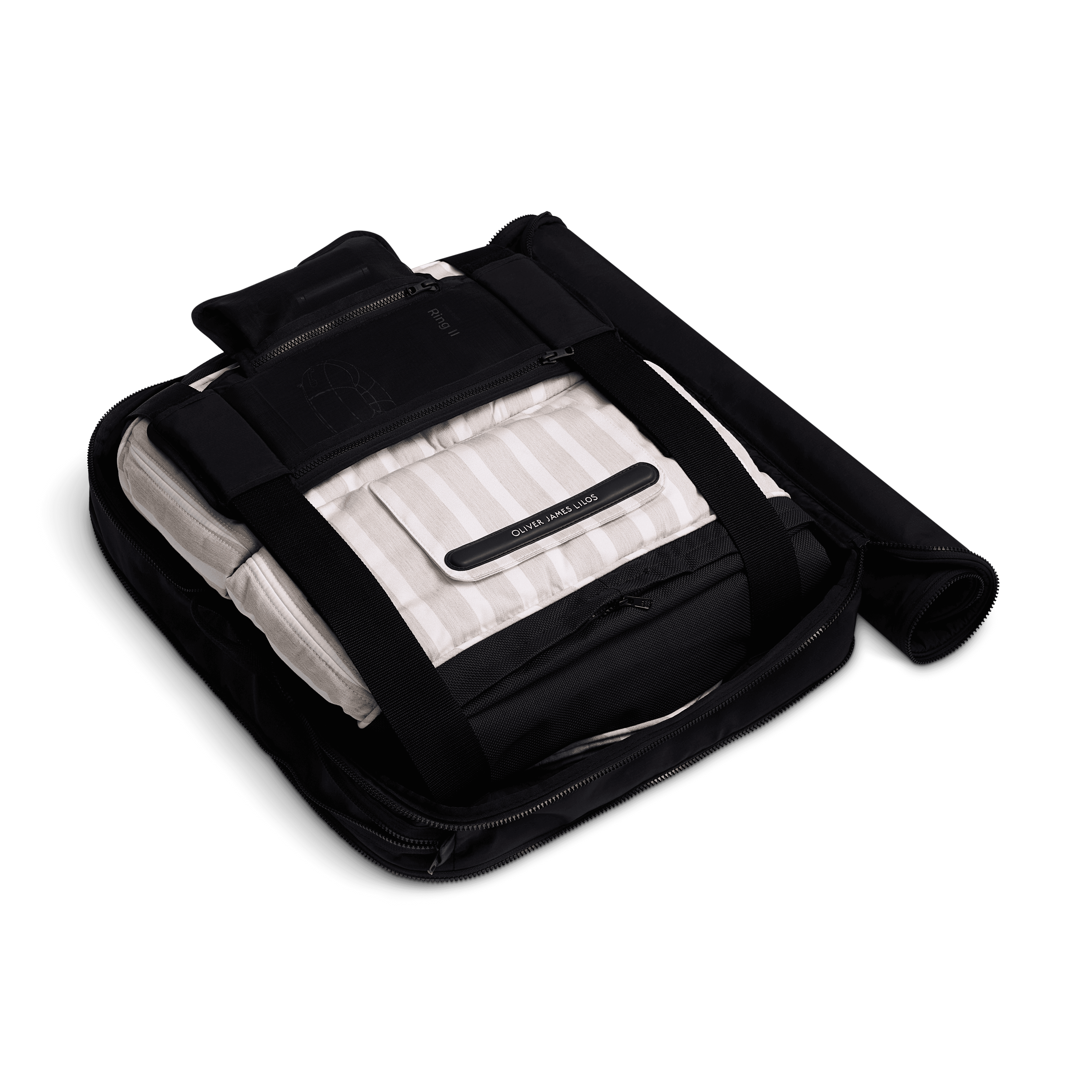 Every mood in a stripe. Linen suits the moment with the signature OJL continuous stripe pattern, running in a loop over the surface of the Lilo and contrasted in vertical stripes on the sides. Beige and white threads are offset with silver stainless eyelets and a jet black base and zipper.